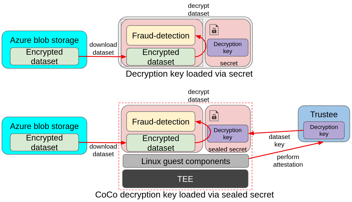 In the above image we can see a similar example as above, with the main difference being that there is no init container, and the key is instead mounted via a secret. While the traditional pod relies on the cluster secrets, which are available to anyone with admin access, CoCo uses sealed secrets, which gets automatically replaced with the actual secret by fetching the secret from Trustee at startup time. Such a process is automatically started by the Linux guest components inside the confidential container.