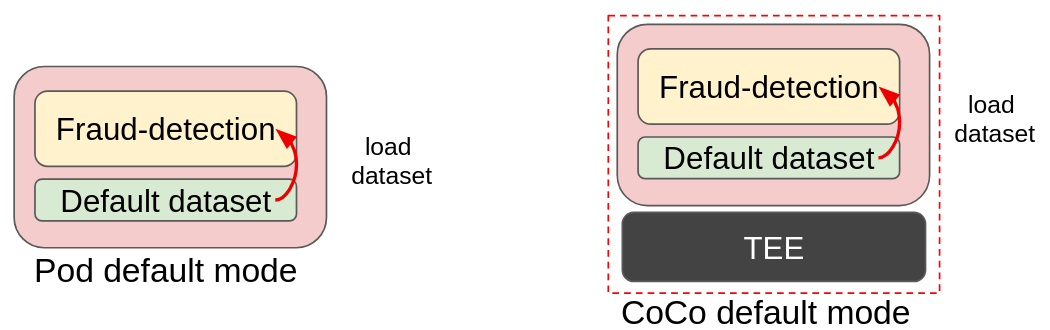 In the above image we can see how the traditional pod is transformed into CoCo: this is the “blackbox” deployment, a very trivial example where the dataset is part of the fraud-detection container image. The dataset is simply loaded into the model and data analysis is performed. Transforming it into a CoCo deployments results in no change in the image, with the benefit of adding an additional layer of protection (memory encryption).